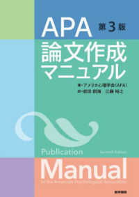 論文作成にかかわる全ての人に必携。待望の最新版。APA論文作成マニュアルは、心理学のみならず、看護学でも広く使われる論文作成のスタンダードの1つである。前版より大きくアップデートされた本版では、論文の構成・書式から、文法知識、偏見のない文章表現、引用文献と内容は多岐にわたり、APA方式にかかわらず、論文そのものを作成するための基本が詰まっている。論文作成に携わる全分野の人の傍らで、きっと役に立つに違いない必携のマニュアルである。