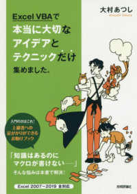 「Excel VBAの文法は入門書で学んだ。基礎の知識はひととおりある。でも、実践になると思うようにマクロが書けない……」。Excel VBAは生産性アップや時短を後押ししてくれる強力なツールですが、こんな“困った”を持つ人が少なくありません。「なぜ書けないのか」を知り尽くす著者の大村あつしさんは、知識とアイデアは別のものと指摘します。「いま持っている知識にアイデアとテクニックを加えればマクロを書くスキルは目に見えて上がる。そして、必ず知っておきたいアイデアの数は厳選できる」と。本書は、自動化、高速化から、データベース、ユーザーフォーム、外部ファイルの操作まで、お持ちの知識を活性化して上級者への確かな足がかりを築くことをお助けします。