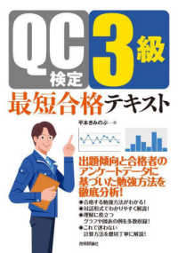 本書はQC検定3級の最短合格を目指す方向けのテキストです。第1章では、著者が試験の出題傾向を徹底的に分析しつつ、合格方法をレクチャしていきます。著者独自の合格者のアンケートデータに基づいて、最短で合格するにはどのような勉強をすればいいか、効率よく勉強するにはどうしたらいいか、具体的にどの分野を勉強したらいいかなどを、分析・一般化し、解説しています。第2章〜第10章は、対話形式で話を展開していくテキストで、新たな学習項目にもスッと入っていけるように工夫しています。グラフや図表やイラスト、例題を多数用いて解説しているので、初心者にも理解しやすいテキストです。また各章に出題頻度に基づいた学習の重要度をつけているので、メリハリの効いた学習ができます。