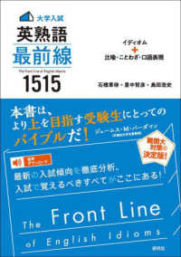 最新の入試問題を精査し、最頻出の基本熟語から難関大を突破する「最前線」の慣用表現までを集めました。熟語の意味をイメージしやすく解説、丸暗記に頼らず熟語を覚えられます。Part 1では熟語を構文ごとにグループ化し、形からまとめて覚えやすくしました。長文の内容一致問題にも多用される「言い換え表現」を豊富に収載。長文読解や作文問題で狙われる「比喩・ことわざ・口語表現」も掲載。熟語を効率よく覚えたい人、関連表現もまとめて覚えたい人、難関大入試でライバルに差をつけたい人におすすめです。