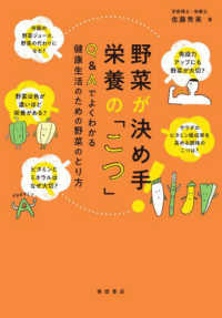 イラストや図表をふんだんに使って1日3 5 0g以上の野菜をとる「こつ」、野菜の栄養の吸収率をよくする食べ方を紹介する。