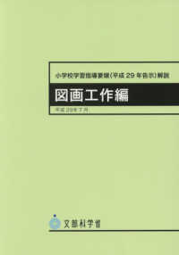 第1章 総説(改訂の経緯及び基本方針;図画工作科の改訂の趣旨及び要点)第2章 図画工作科の目標及び内容(図画工作科の目標;図画工作科の内容 ほか)第3章 各学年の目標及び内容(第1学年及び第2学年の目標と内容;第3学年及び第4学年の目標と内容 ほか)第4章 指導計画の作成と内容の取扱い(指導計画作成上の配慮事項;内容の取扱いと指導上の配慮事項 ほか)付録(学校教育法施行規則(抄)小学校学習指導要領第1章総則 ほか)