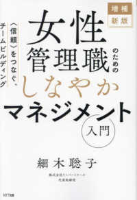 モデルが少なく孤立しがちな女性管理職を、NTTでのべ1000人の人材育成に携わってきた著者が〈6つの力〉と〈メソッド〉でサポートする「はじめての女性管理職の教科書」。生産力を2倍に、離職率を50%ダウンさせてきた著者の力の源は「信じる力」。部下を信頼し、可能性を引き出す支援型リーダーシップで、持続的な成果を導く、「しなやかマジメント」を2024年度版にバージョンアップ。巻末に元 東レ取締役の佐々木常夫氏とのダイバーシティ対談を収録した増補新版。