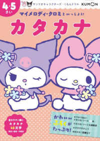 こんなお子さまに―カタカナが少し読めるようになってきたお子さま、サンリオキャラクターといっしょに楽しく学習してみたいお子さま。こんなドリルです。マイメロディ・クロミのかわいさがつまった、迷路やパズルがたっぷり!だいすきなキャラクターといっしょだから、最後まで楽しく学習できます。書きやすいものから順に、48文字のカタカナの読み書きを学習します。くもんドリルの学びやすさはそのままに、楽しさをプラス。無理のないくり返し学習でしっかり身につきます。お子さまのがんばる気持ちを応援する、かわいいふろくがいっぱい。