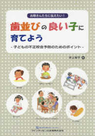 お母さんたちに知っておいてほしい! 歯並びの良い子に育てるポイント!近年、育児環境の変化の影響か歯並び・咬み合わせの悪い子どもが増え、子どもの歯並びに対する世の中の関心も高まっている。本書は矯正臨床歴約40年の著者が、母親たちにぜひ伝えたい願いをまとめた啓蒙書。「幼小児期の適切な対応で予防できる不正咬合があり、将来外科的矯正治療などせずにすむ場合もあること、毎日の子育てで心がけたい生活習慣のありかた」などをわかりやすく解説した。待合室図書、患者説明用にも活用できる。