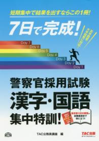 【警察官採用試験の国語・漢字対策に「効く」1冊!】 各都道府県の警察官採用試験で課されている「国語試験」。これは漢字の読み・書きを答える記述式試験です。また、五肢択一式の「教養試験」においても、「四字熟語」「慣用句」「故事成語」「ことわざ」等、国語の問題が出題されます。国語・漢字が苦手な受験生が短期間で効率よく学習できるよう、7日間の集中特訓問題と、全3回の確認テストを1冊にまとめました。もちろん、大卒程度試験・高卒程度試験の両方に対応しています。苦手を克服して、合格ライン突破を目指しましょう!【本書の特長】 ■本番と同じ形式で漢字を特訓! 漢字は1回の解答時間20分で読み・書き各30問、本番の試験と同じ条件で学習できるよう構成されています。 ■漢字は読み・書き各630問、国語は210問を学習できる! 漢字は読み・書き各30問×3セット、国語(「四字熟語」「慣用句」「故事成語」「ことわざ」)は30問が1日分。これを各7日分で、漢字は読み・書き各630問、国語は210問を学習できます。■単独でも学習できる解答冊子!取り外し可能な解答冊子は付属の赤シートで直前期の暗記にも役立ちます。本試験のまさに直前まで使えます。 ■学習しやすい解答用紙つき! コピーして使える解答用紙つき。サイバーブックストアからダウンロードも可能です。