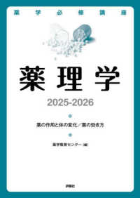 1 薬の作用と体の変化(薬の作用機序;医薬品の安全性)2 薬の効き方(神経系に作用する薬;免疫・炎症・アレルギー及び骨・関節に作用する薬;循環器系・血液系・造血器系・泌尿器系・生殖器系に作用する薬;呼吸器系・消化器系に作用する薬;代謝系・内分泌系に作用する薬;感覚器系・皮膚に作用する薬;病原微生物(感染症)・悪性新生物(がん)に作用する薬薬物の基本構造と薬効)