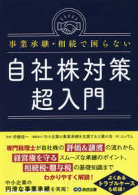 これ一冊で自社株対策の基本がスッキリと理解できる!中小企業の経営者をターゲットに、事業承継・相続を見据えた自社株対策を紹介する入門書。自社株とは何か、自社株の評価方法、譲渡の仕方、後継者へのスムーズな経営権の移譲など全般的な知識が得られる。