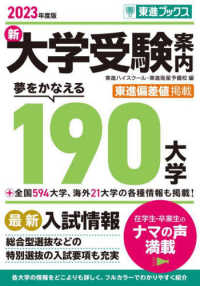 全国788大学から,主要190大学をクローズアップ!190大学の基本情報から入試要項までフルカラー・写真付きで紹介!生徒10万人以上の東進が誇る各種受験データが満載!在学生や卒業生による「ナマの声」で,大学の”今“がわかる!