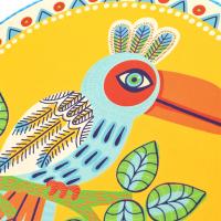 ユニークな鳥のイラストと鮮やかな色合いが目を引く子どもサイズの木製タンバリンです。