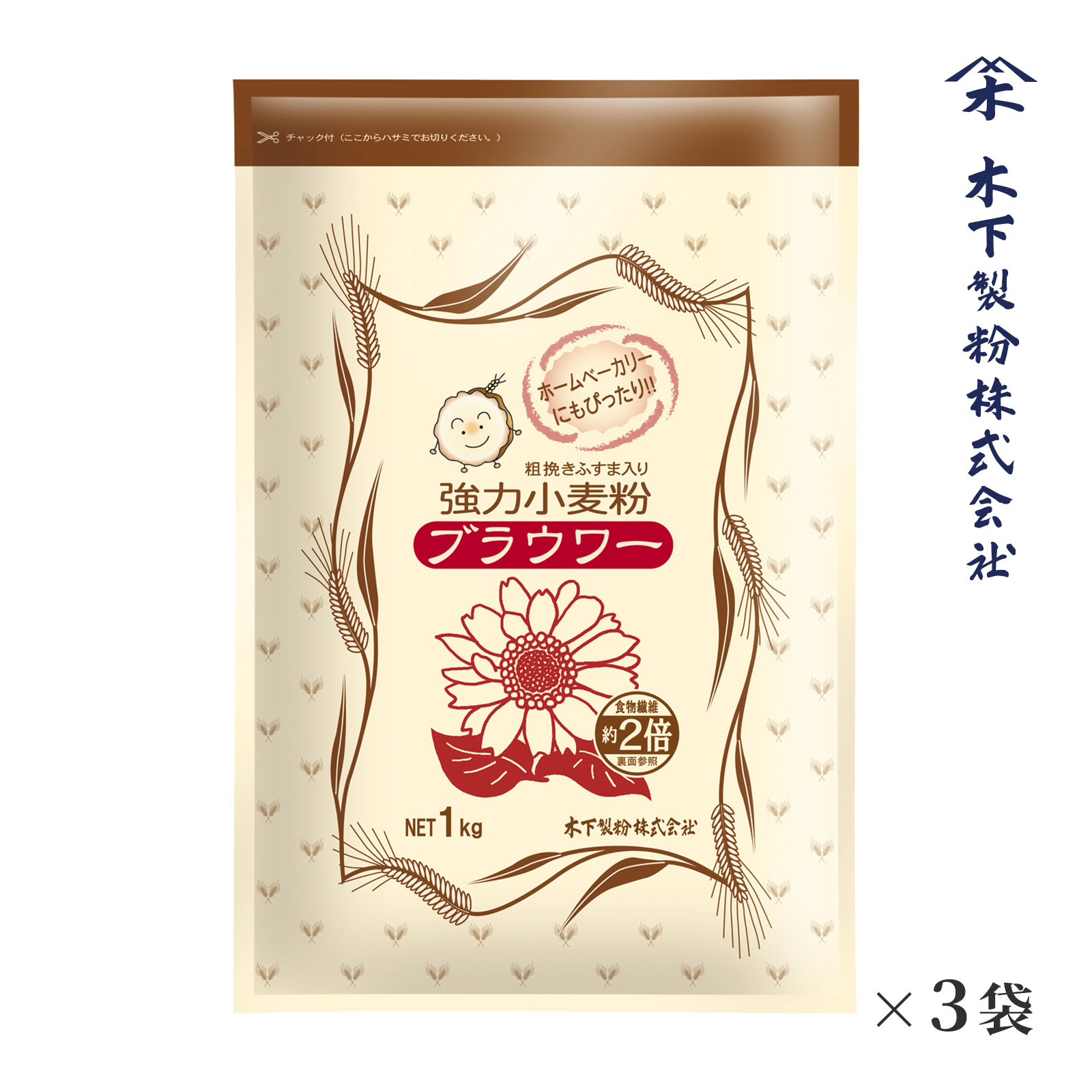 木下製粉 ブラウワー 3kg(1kg×3袋) パン用 粗挽きふすま入り強力粉 小麦粉 ファリーナコーポレーション
