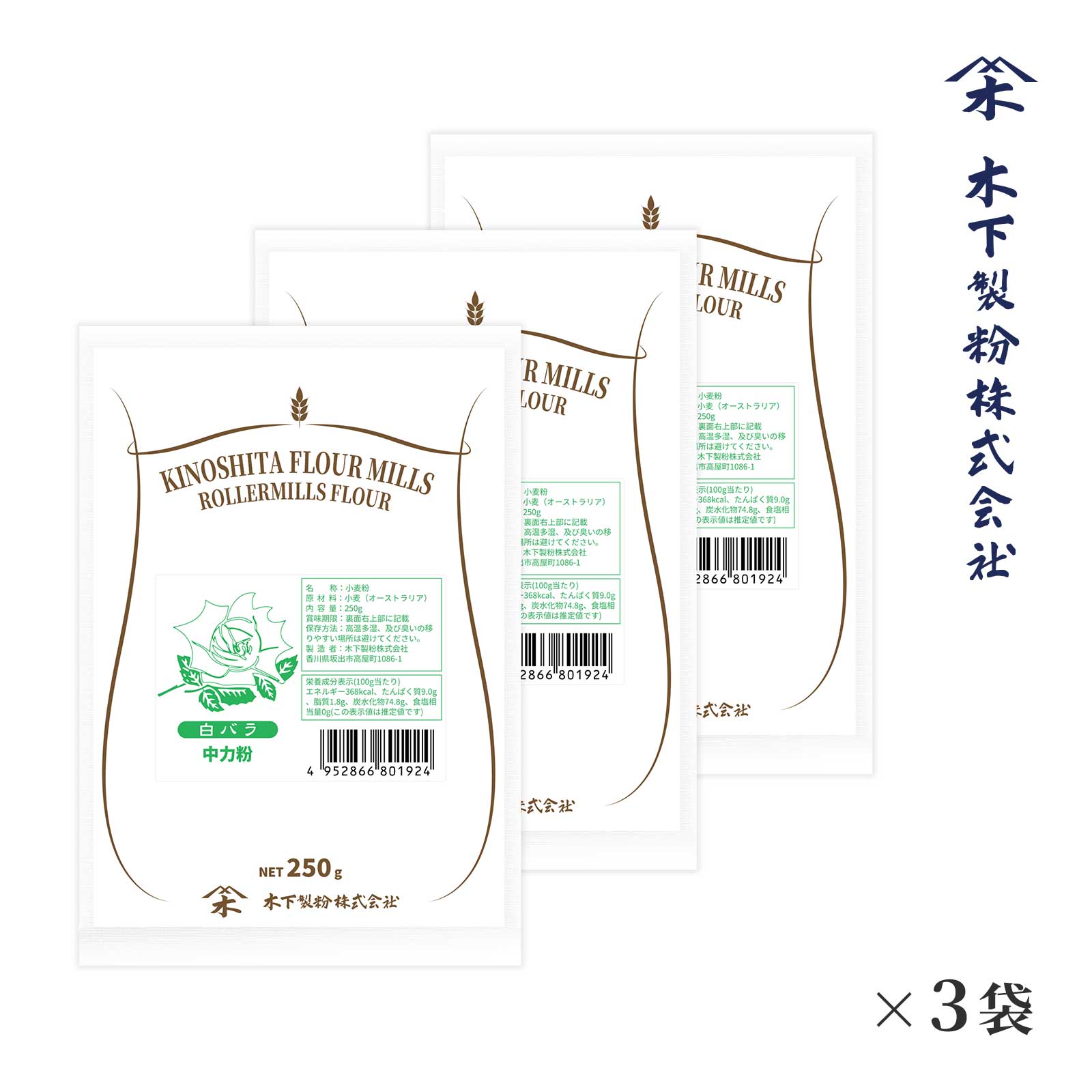 木下製粉 白バラ 250g × 3袋 手打ちうどん用 中力粉 小麦粉 ファリーナコーポレーション
