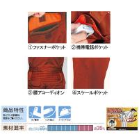 ●春夏用 ●素材/ポリエステル65%、綿35%(210g/平方メートル) ●ファスナーポケット、携帯電話ポケット、腰アコーディオン、スケールポケット ●サイズ:S(胸囲/110、肩巾/44、総丈/149、袖丈/53、胴囲/84、股下/74)、M(胸囲/116、肩巾/48、総丈/154、袖丈/56、胴囲/90、股下/76)、L(胸囲/120、肩巾/50、総丈/159、袖丈/58、胴囲/94、股下/78)、LL(胸囲/124、肩巾/52、総丈/164、袖丈/60、胴囲/98、股下/80)、3L(胸囲/128、肩巾/54、総丈/169、袖丈/62、胴囲/102、股下/82)、4L(胸囲/136、肩巾/56、総丈/174、袖丈/64、胴囲/110、股下/84)、6L(胸囲/148、肩巾/58、総丈/175、袖丈/64、胴囲/122、股下/84) ●カラー:ネイビー、ブラック、ブルー、シルバーグレー、チャコールグレー、レンガ |