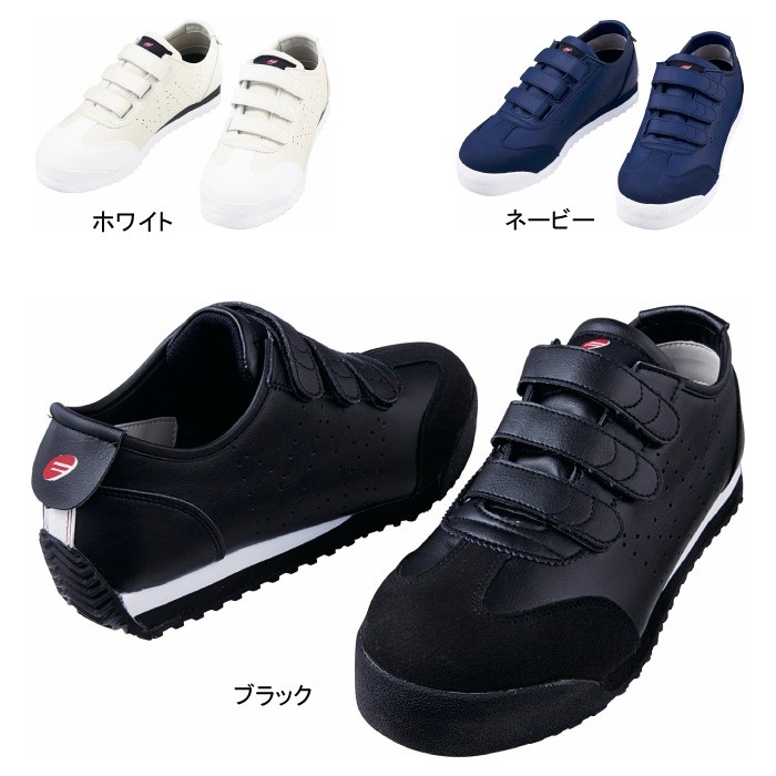 ・オールシーズン・素材:アッパー:合成皮革、ミッドソール:EVA、アウトソール:合成ゴム(耐油ラバー)、先芯:スチール芯・機能:JSAAA種認定品、耐滑仕様、抗菌防臭機能、衝撃吸収、プロテクティブスニーカ規格型式合格品、認定番号:1508・重量:約400g標準/26cm(片足)・ウィズ:3E・カラー:ネービー、ホワイト、ブラック
