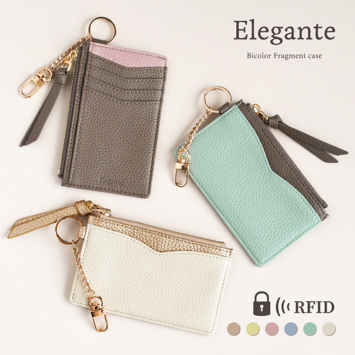 | 商品説明 | 【Elegante Bicolor Fragment case】 当店オリジナルブランド エレガンテ のバイカラー フラグメントケース。 コンパクトさと収納力を兼ね備えた、便利でお洒落なデザインです。 クレジットカード、キャッシュカード、診察券、ポイントカード、免許証等のカードを収納できます。 小銭・お札の現金が入るファスナーポケット付きでミニ財布やセカンドウォレットとしても使用できます。 高級感のある上品なバイカラーが大人可愛いデザイン。 小さなバッグに収納できる小さめサイズなので、ショッピングやお出掛け、通勤・通学にもおすすめです。 チェーンとリング付きなので、鞄に取り付けたり、鍵を取り付けてキーケースとして使用することもできます。 |