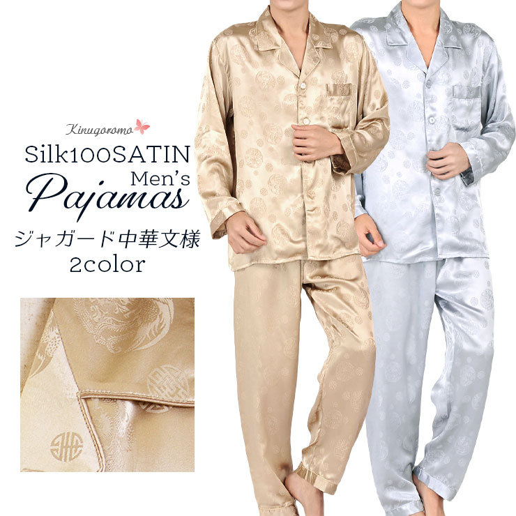 シルク100% ジャガード シルクパジャマ サテン 長袖 チャイナ ロゴ メンズ 紳士 安眠 ナイトウェア ルームウェア ゴールド/シルバー L/XL/XXL 送料無料 fts15