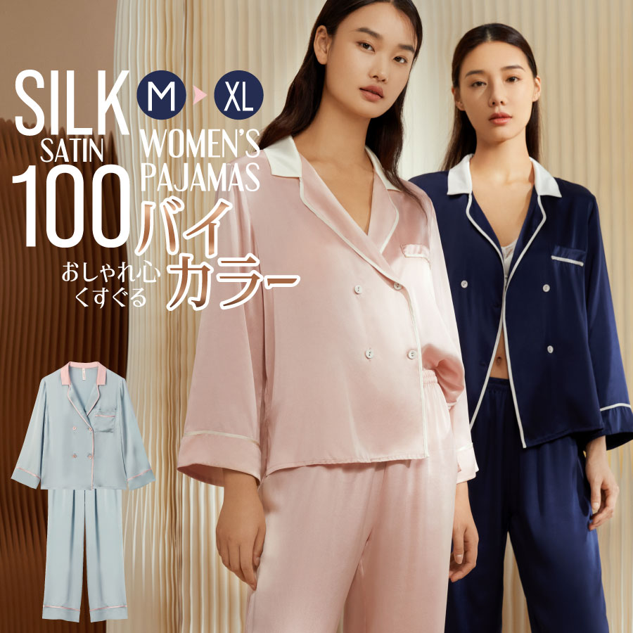 シルク100% パジャマ バイカラー パイピング シルクパジャマ ダブルボタン 配色 前開き 上下セット 長袖レディース シンプル 3カラー M/L/XL