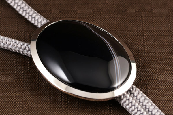 真っ黒なオニキスの右端に縦に入った白い層状の模様が、さりげないお洒落感を演出しています。世界に一つだけの模様です。
