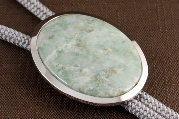 人気の高い国産の翡翠をループタイにしました。濃淡のある黄緑色や白色をした翡翠で高級感のある一品です。