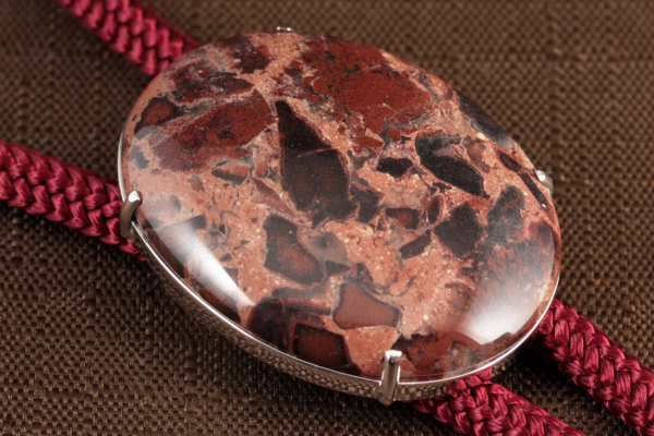 赤色の濃淡や灰色の結晶が入り、不規則な模様をしています。