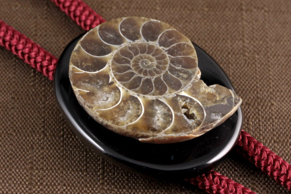 こちらのループタイは板状のオニキスの上にアンモナイトがついています。
