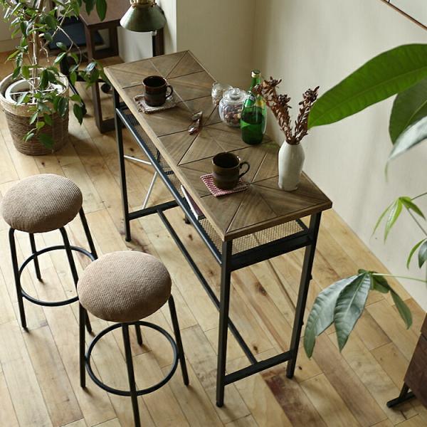くっきりとした木目が特徴のパイン材を三角形に切り出し、幾何学模様に配置し、使い込まれたかのような古材風に仕上げたヴィンテージを感じるカウンターテーブル。色むらなどをつけることで、届いたその日から、昔からお家にあるかのような佇まいを感じていただけるアイテムとなっています。
