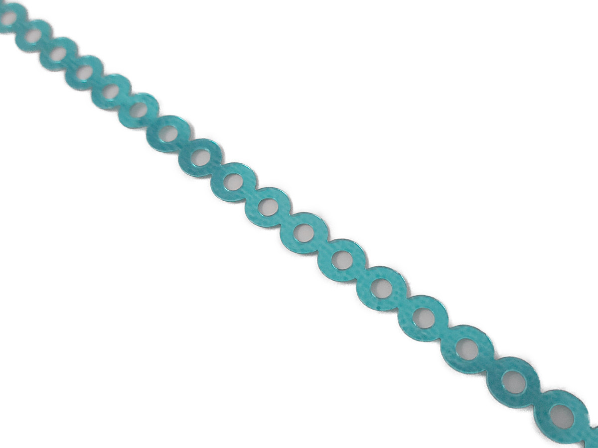 服の上から縫いつけるタイプの珍しいタイプのスパンコールテープです。プランニング中の手芸・リメイク作品の上から、ざっと縫いつける感じの使用をイメージして下さい。スパンコールが連なって一例になっているので、簡単・手早く、キラキラの作品が出来上がります。
