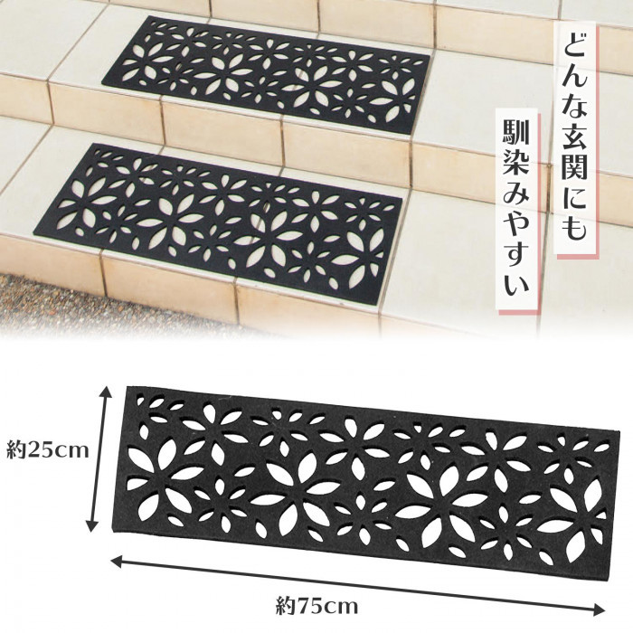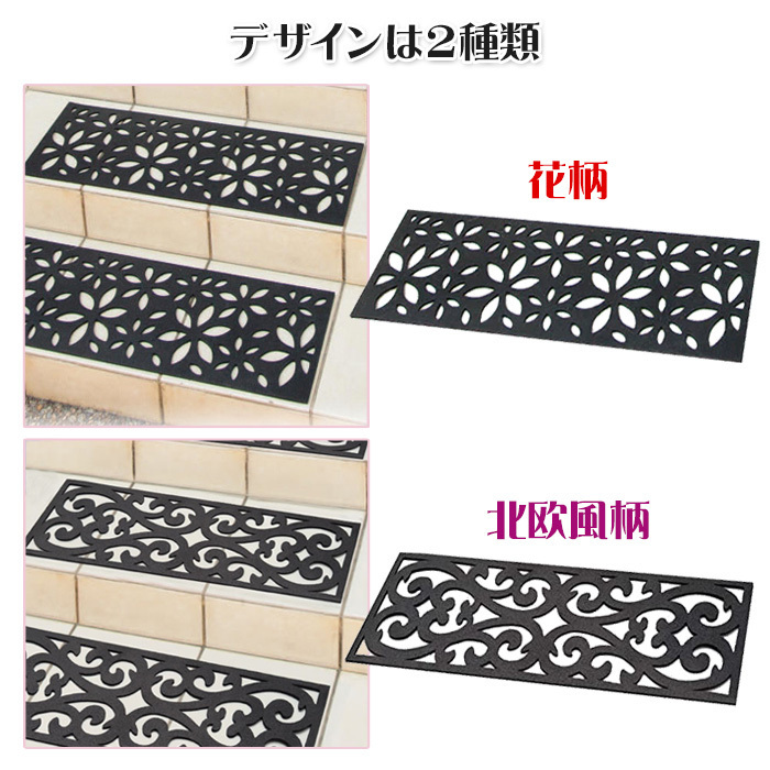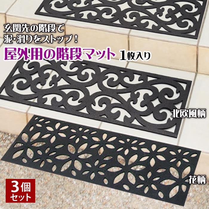 屋外用の階段マット 3枚セット 北欧柄/花柄 75×25cm 階段マット 玄関マット 屋外 泥落とし 砂落とし ゴム おしゃれ 屋外マット 雨 雪 滑り止め ラバーマット