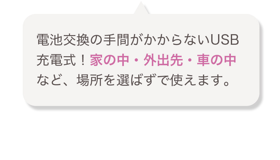 電池交換の手間がかからないUSB充電式!