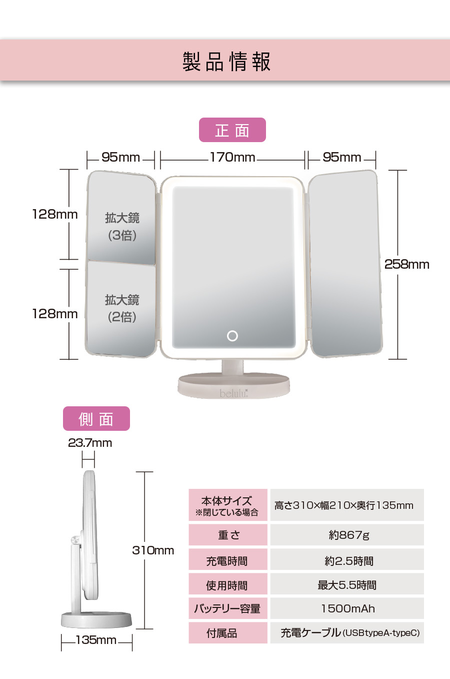 機能面(明るさ・角度調整・三面鏡構造など)は従来モデルと同様の仕様となっておりますので、安心してご使用いただけます。