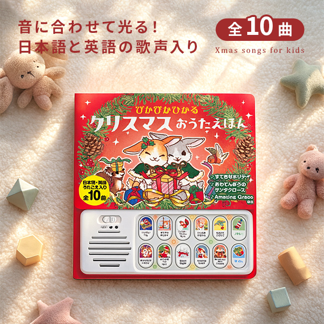 定番のクリスマスソングを、日本語・英語の歌声で全10曲収録しています。聞きたい「おうたボタン」を押すと歌が流れ、「リズムボタン」を押すと歌に合わせて6種類の効果音が鳴ります。さらに、音に合わせてパネルのライトがピカピカ光ります。歌詞が書かれた絵本とパネルのボタンには、優しいタッチのイラストが描かれているので、0〜3歳頃のまだ字が読めないお子様でも楽しめます。
