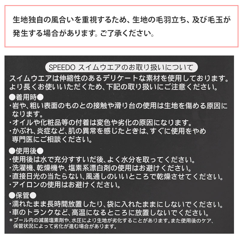 | 水着本体 | ウエストひも:○ ポケット:なし インナーパンツ:なし(前側裏地のみ) |