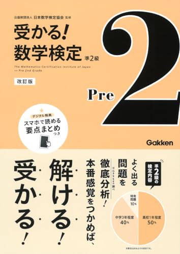 ¥数学検定準2級(高校1年生程度目安)の対策用問題集/ ●よくでる問題から、効率的に! 近年実施された検定問題を、Gakken編集部が徹底的に分析! 頻出問題を優先して掲載しているので、効率的に合格力を高めることができます。はじめに単元の重要ポイントをおさえつつ、「基本練習」「実戦練習」と徐々に問題もステップアップ! 解き進めるうちに、無理なく検定レベルの問題が解ける実力が身につきます。 ●1次・2次の二部構成で、本番の心構えができる! 数学検定の準2級は、主に計算力を測る計算技能検定(1次)と、応用力を測る数理技能検定(2次)に分かれています。同じ単元でも1次と2次で問題傾向が異なるため、それぞれのちがいをきちんと理解したうえで本番に臨むことが望ましいです。本書は二部構成になっており、前半で1次の対策、後半で2次の対策、とそれぞれのちがいを意識しながらしっかり対策することができます。 ●本番そっくりの模擬検定問題 & スマホで読める要点まとめつき! 巻末には、「模擬検定問題」が1回分ついています。学習の最後に挑戦して、自分の実力を確かめるとともに、本番の出題形式や時間感覚