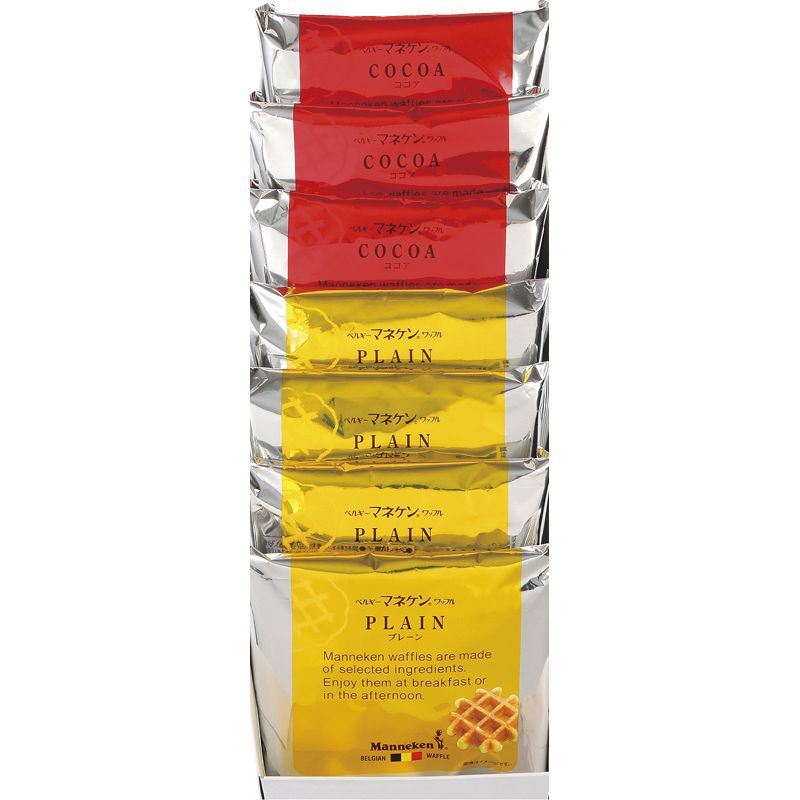 ベルギー産パールシュガーを始め厳選した食材を使って焼き上げ、マネケンならではの独特の食感と風味に仕上げました。ちょっとしたプレゼントや手土産に最適です。 【セット内容】プレーンワッフル×4、ココアワッフル×3 【箱サイズ】30×11×8cm 【箱入重量】0.5kg 【賞味期間】常温60日 【アレルゲン】卵・乳・小麦 [ お菓子 洋菓子 スイーツギフト セット 詰め合わせ ]