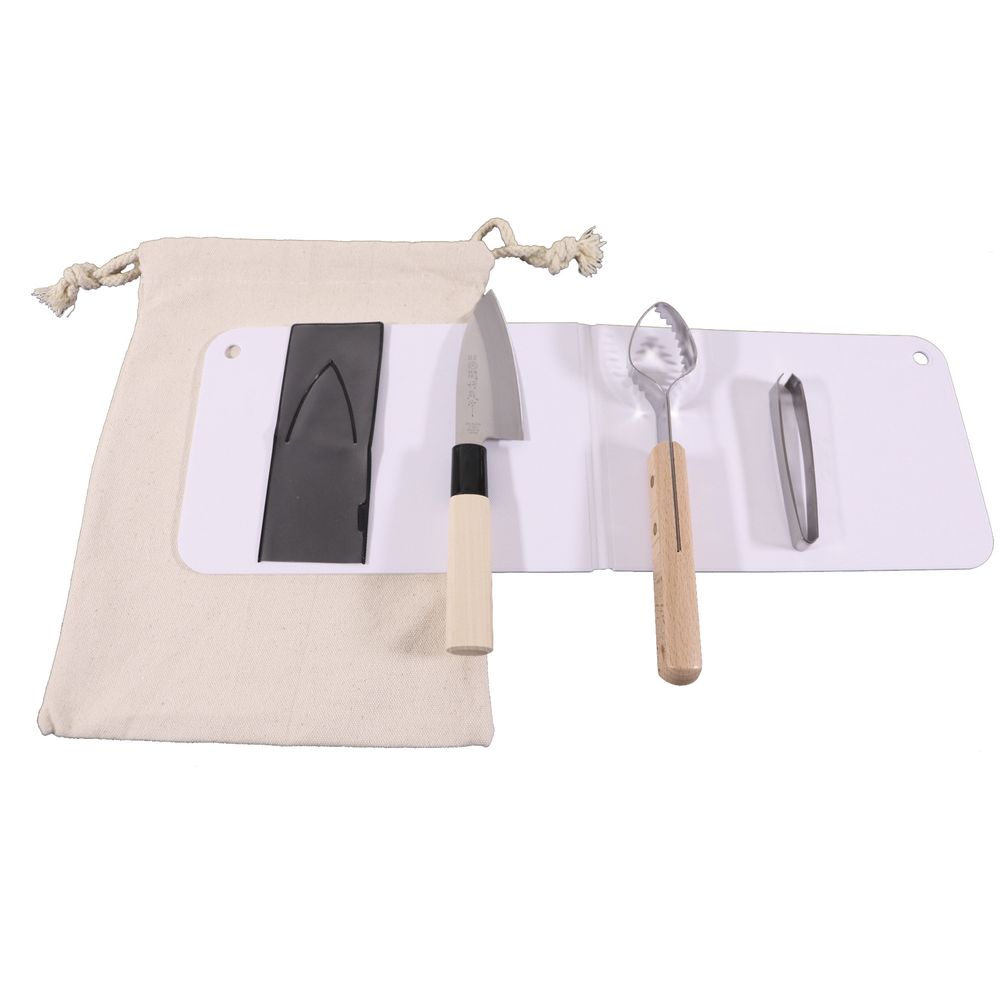 ウロコ取り・骨抜き東105mm・たためるまな板・小出刃110mm・巾着袋・各1個 まな板サイズ:440×150mm(収納時220×150mm)