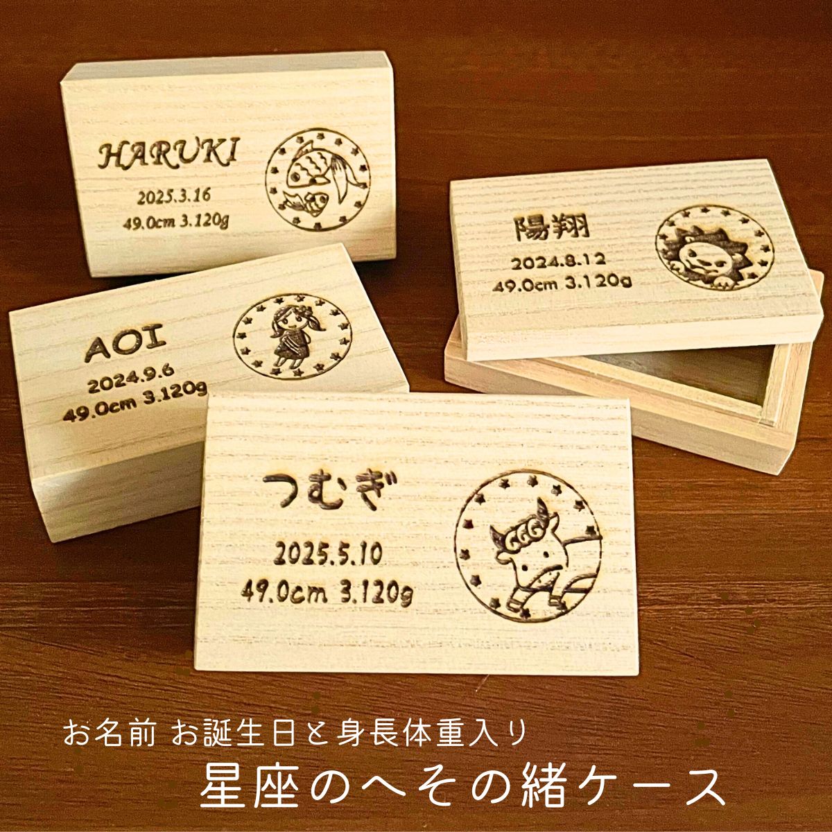 「kiribox」の星座のへその緒ケースは、星座のイラストが美しく焼き入れられ、お子さまの名前やお誕生日・身長・体重を刻むことができます。職人によって一つ一つ丁寧に作られているため、とても美しく高品質で、出産祝いや誕生日のプレゼントとしても喜ばれることでしょう。おしゃれでかわいいデザインは、男の子にも女の子にもぴったりです。大切な思い出をこのケースに保存し、いつまでも心に残る記念品にしてください。