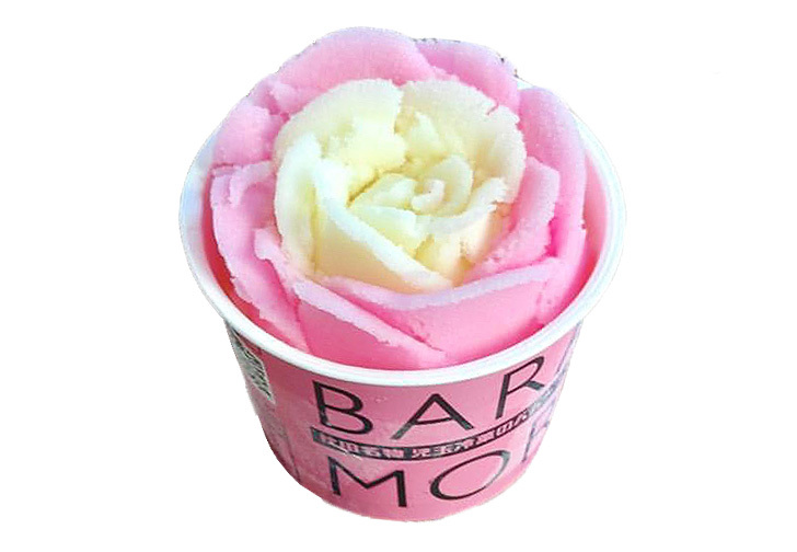 バラが咲いたように盛り付ける「バラ盛り」を一つ一つ手づくりしたカップアイスです。