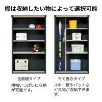 背の高いものやゴルフバック等をスマートに収めたい方に適しています。 棚板を片側に寄せ、もう一方を床から天井まで吹き抜けのフリースペースにしたタイプです。スキー板、ゴルフバッグ、釣り竿といった長尺物と、小さな荷物をこれ1台で左右に分けて管理できます。ネット棚が付属するモデルもあり、上部空間まで無駄なく活用できます。