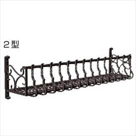 大きめの植木鉢やプランターなどを窓辺で楽しめる本格的なフラワーボックスです。飽きのこないシンプルでオードソックスなデザインと、細部にこだわりの装飾を施した流麗なデザインの2タイプに加え、木目調の温かみをプラスした3型をラインアップしています。自然のやすらぎが暮らしにゆとりを演出するフラワーボックスです。2型は角棒を曲げたイメージで、直線部分のねじりを特徴としています。ハンマートーンの質感、先端部のあっさりとした唐草などで、シンプルで使いやすいデザインに仕上げました。