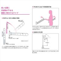 アームの角度を2段階で調整することができます。また、収納すれば壁面からの出っ張りを最小限に抑えることができます。竿の中心を持って操作すれば、左右のアームを同時に動かすことができます。アームの角度を変えるたびに、ポールを外す手間がありません。収納したときに竿の位置を高く保つことができる「振り上げ収納」を採用。