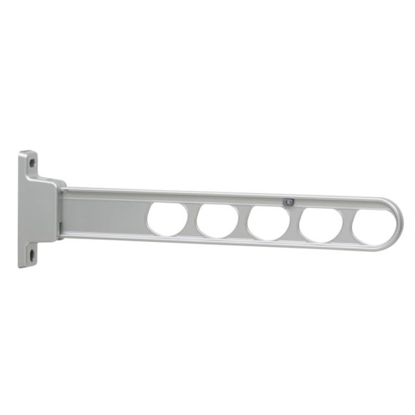 アームの角度を2段階で調整することができます。また、収納すれば壁面からの出っ張りを最小限に抑えることができます。竿の中心を持って操作すれば、左右のアームを同時に動かすことができます。アームの角度を変えるたびに、ポールを外す手間がありません。収納したときに竿の位置を高く保つことができる「振り上げ収納」を採用。