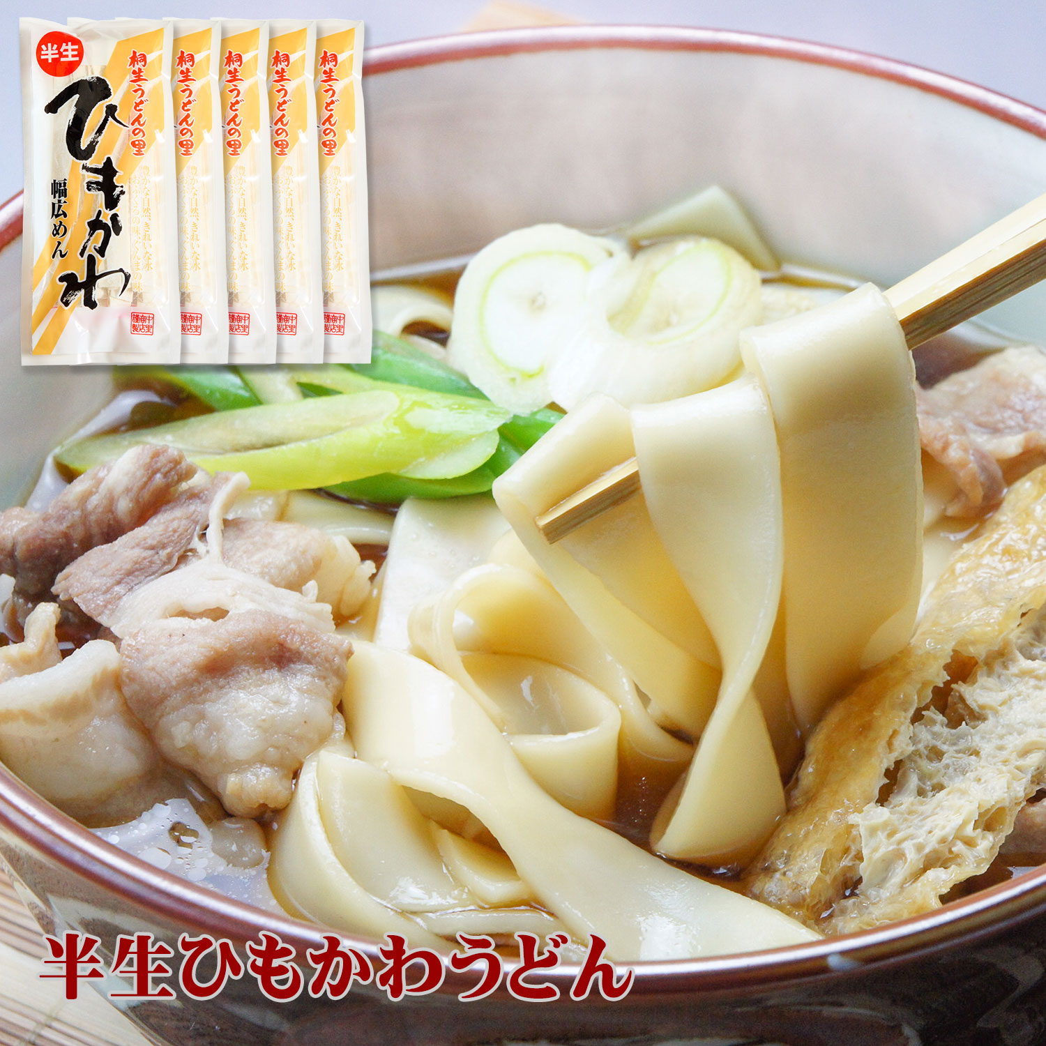 群馬県で古くより親しまれてきた幅広麺ですゆで幅3センチの半生幅広うどんです。