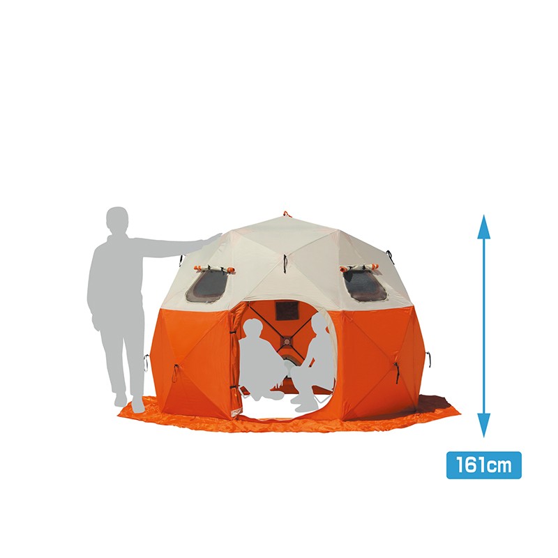 ■12箇所ある紐を引くだけの簡単設置。一番最初に引く天井の紐はオレンジ色、その他は黒で色分けされています。■強度のあるグラスファイバーフレームをクロスさせた正方形が12面集まり、8角形のドーム型テントとなっています。■そのため、どの方向から風がふいても安定感がある耐風性の高い構造を実現しました。■8角形のため、デッドスペースが少なく広々とした空間が確保出来ます。■出入りがラクな広めの出入り口設計。■扉1カ所・窓4カ所・通気口3カ所のすべてに開け閉め可能なメッシュを装備。一酸化炭素中毒を防ぐだけでなく害虫の侵入を防ぐのでキャンプやグランピングなどでも活躍します。■持ち歩きに便利な背負える収納バッグは大口の巾着タイプで出し入れも簡単。■コンパクトなレギュラーサイズ、大人が立てるセミラージサイズ、みんなで広々ラージサイズ、釣行人数に合わせて選べる3サイズをラインナップ。■ワカサギ釣りをはじめ、キャンプやグランピングでも使えます。■お手頃な価格でご提供するためクイックドームテント パオグランにはフロアシートは付属しておりません。