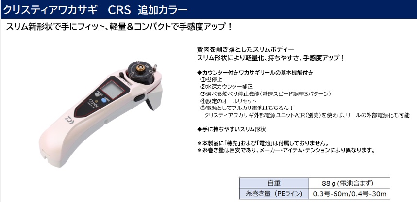 ■スリム形状により軽量化、持ちやすさ、手感度アップ。■カウンター付きワカサギリールの基本機能付き■手に持ちやすいスリム形状
