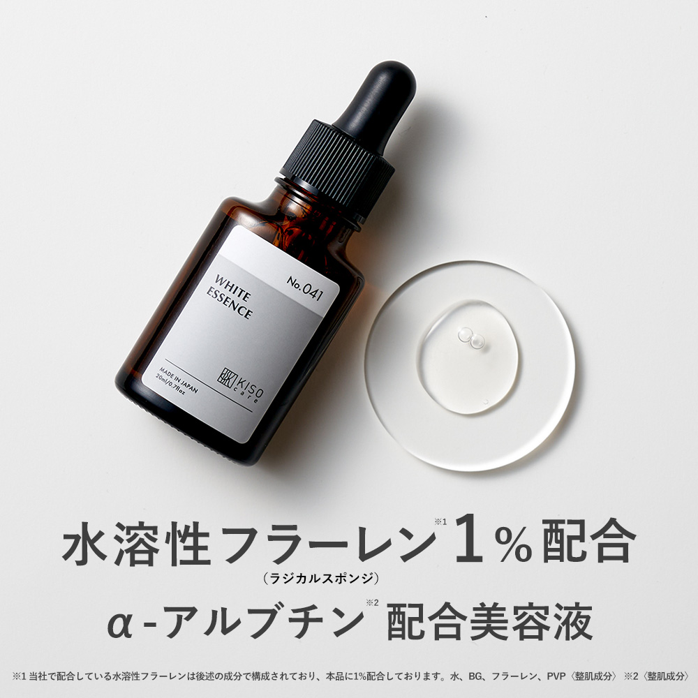 水、グリセリン、プロパンジオール、ペンチレングリコール、パルミチン酸アスコルビルリン酸3Na、フラーレン、α-アルブチン、シロキクラゲ多糖体、ヒアルロン酸Na、グリチルリチン酸2K、ツボクサエキス、オウゴン根エキス、イタドリ根エキス、カンゾウ根エキス、チャ葉エキス、ローズマリー葉エキス、カミツレ花エキス、BG、エチルヘキシルグリセリン、PVP、ピロ亜硫酸Na、フェノキシエタノール |