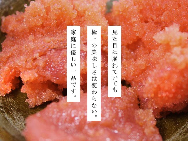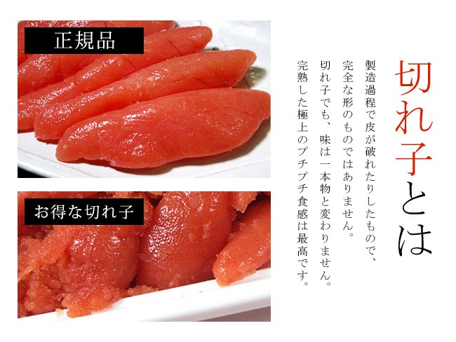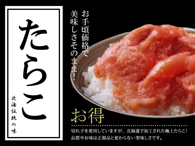 ![]() 北海伝統の味のたらこになります。 切れ子なので形はキレイとは言えませんが、 品質や味は正規品と変わりないのでお手頃価格でお買い求めいただける贅沢な一品となっております。 ぜひ、一度ご賞味くださいませ。 ![]() ![]() 【赤いダイヤと呼ばれるタラコについて】 たらこはタラの魚卵で、それを加工した食品です。 タラとはいえ一般的にたらこと呼ばれるのは スケソウダラの魚卵を言います。 ご飯にそのまま乗せて食べたたり、少し焼いて焼きタラコとして食べたり、パスタや様々な料理等幅広く使用されています。 以前はタラコではなく、鱈の子と呼ばれていましたが、次第にカタカナでタラコと表記される事が多くなり、今ではタラコがポピュラーな呼び名になっています。 栄養面:カリウムやリン、亜鉛などのミネラルが多くビタミンもA、E、B群と豊富に含んだ優れた食材なのですが、保存に多量の塩を使います。 食べる際は適量に配慮し、調理に工夫する必要があると言われております。 ![]() 【お召し上がり方は色々あります】 弱火でこんがり香ばしく焼いて焼き鱈子! 何杯でもおかわりしたくなる美味しさです。 おにぎりの具材や熱いお茶をかけ、山わさびをちょっと添えて、たらこ茶漬け! イカと和えて酒の肴としたり、パスタにたらこをあえてタラコスパゲッティ!幅広く調理にお使い頂けます。