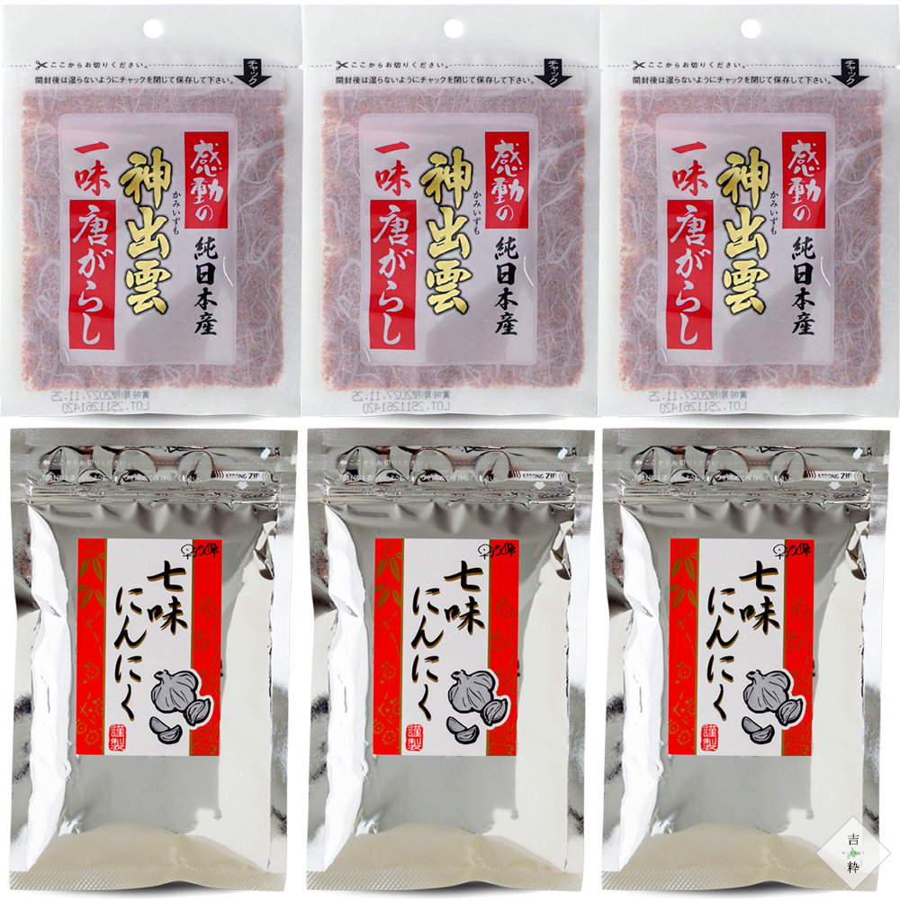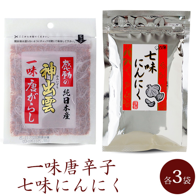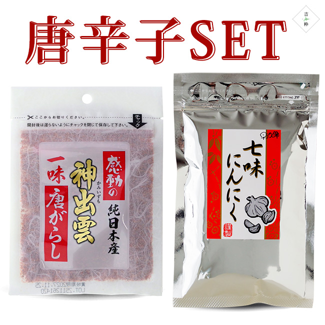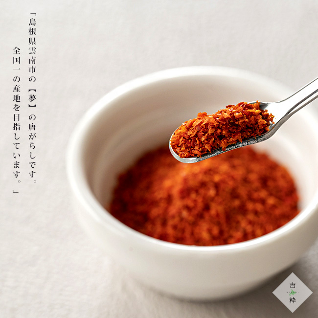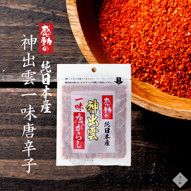 驚きました!美味しいです!素晴らしい調味料です!『七味にんにく』&『一味唐辛子』を使用しただけで劇的に料理が生まれ変わります!どんな料理にも使いたくなってしまう魔法の様な調味料です!! 見た目は普通の七味唐辛子と同じですが、香りと味は全く違います。これまでの七味唐辛子の概念を根底から覆してくるような素晴らしさです!![]() 七味唐辛子は、唐辛子を主原料とした日本独特のミックススパイスです。現在では七味唐辛子という呼び方が主流ですが、以前は七色唐辛子と呼んだり、七種唐辛子と呼んだりしたそうです。七味唐辛子の語源ともなる、唐辛子と七種の原料を使った唐辛子の事で、この七種の調味料に関しては七味唐辛子を作る生産者の好みで色々と組み合わせているそうです。また、副原料の種類の数も7種類と決まってもおらず、多い種類の調味料を組み合わせているのもあります。 自分好みの七味唐辛子を探すのも楽しそうですが、この『七味にんにく』もその候補に入れてみてください! 唐辛子という主原料に副原料を加える理由としては、辛味を抑える役割や風味を良くする為のようです。『七味にんにく』に入っているのは陳皮・にんにく・黒胡麻・白胡麻・青さ・麻の実・けしの実が使われています。使用する割合等で味わいが変わるのも七味唐辛子の楽しいところかもしれません。 島根県雲南市で栽培された、大変希少な唐辛子を使用した一味唐がらしです。 島根県雲南市の唐がらしを、北の国から応援します。 【神出雲唐辛子とは…】島根県で栽培されている、純国産の唐辛子です。 色艶が良く、風味豊かで辛味の中にも旨みがあるのが特徴です。 害虫対策のために、面積ごとの作付け本数を通常より少なくすることで低農薬を実現しました。 風味が強く適度な辛味とほのかな甘味とのバランスが絶妙で、最高級の唐辛子です。 漬物やお料理等にお使いいただきますと、素材の味が存分に引き立ちますよ♪