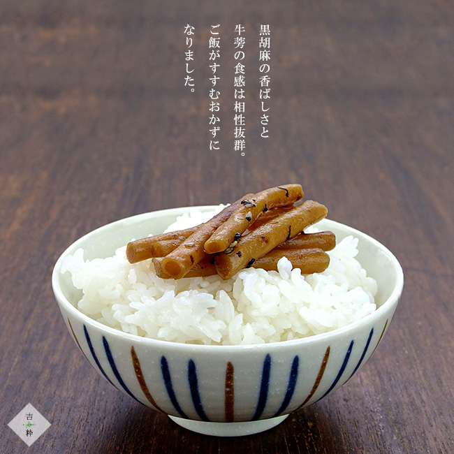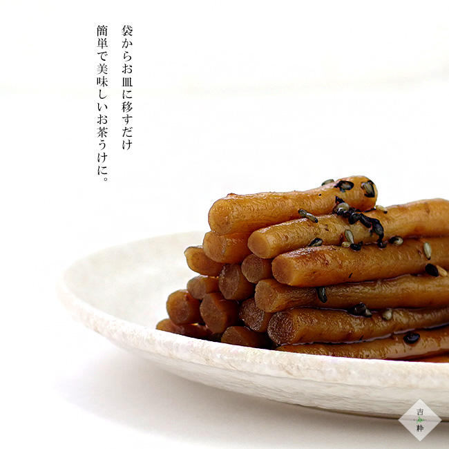 ご飯がすすむ一品の【黒胡麻ごぼう】です!香ばしい黒胡麻の風味が食欲をそそります。そしてゴボウの味わいが引き立つように、さっぱりと醤油漬けの味付けに仕上げました。 素材にこだわり、国産のゴボウ・生姜・昆布を使用し、丁寧に手をかけて作っているから、シャキシャキとした歯ごたえが癖になる美味しいお漬け物になりました。 【食物繊維が豊富なゴボウ】ごぼうは食物繊維がとても多く含まれているという事は皆さんご存知かと思います。 この食物繊維は大きく2種類に分けられ、1つは菊芋に多く含む『イヌリン』と水に溶けない食物繊維の『リグニン』です。リグニンとは構造上の基本形式が発達した植物の、根・茎・葉に分化している高等植物の木化に関与する、高分子のフェノール性化合物です。 ゴボウに含まれているその他の健康成分オリゴ糖・ビタミンB2・ビタミンB1・ビタミンC・フラクトオリゴ糖・ブドウ糖・ペルオキシダーゼ等があります。 【黒ゴマ】黒胡麻は種皮が黒色のゴマです。白ごまと比べると脂質が少ないですが、栄養面の違いはほぼありません。大きな違いは、見た目以外に、黒ゴマの方が香りが強く、ほのかな苦味とコクを味わえます。主張する食材と合わせても負けないので、胡麻の風味を味わえる料理に向いています。また、見た目にもアクセントになりますので、美味しそうに見せるのにも役立ちます。 ごぼうには食物繊維が豊富に含まれヘルシー食品としても注目されています。ごぼうの風味やうまみは皮の部分に多く含まれているので薄皮を残し、ごぼうの風味を大切に仕上げました。 大きくなる前に収穫した国産ごぼうを使っているので、シャキシャキとした食感が楽しめます。また、牛蒡の味わいが引き立つようにさっぱりと醤油漬けにしています。 素材にこだわり、丁寧に手をかけ、美味しく仕上げました。ホカホカご飯のお供に、お茶うけ、お酒の肴にピッタリの【黒胡麻ごぼう】です。どうぞお召し上がりくださいませ。