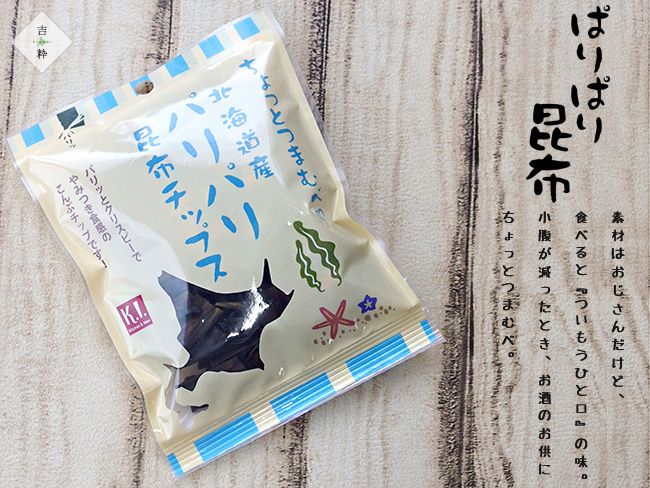 北海道産の昆布を乾燥させてオヤツにした【パリパリ昆布】です。普通のおやつ昆布以上に「パリンッ」とした軽くて楽しい食感が楽しめます!![]() 【優れた味を持つ北海道産昆布】昆布は食感の良さや美味しさ、そして出汁用として好まれています。カルシウムやビタミン、 そしてミネラルやヨードといった健康に必要な栄養素がたっぷりと含まれているアルカリ性食品です。特に注目されているのがヨードという成分で、健康を意識した方たちに期待がもたれている成分で、このヨードが他の食品よりも 断然多くふくまれています。そして最近注目されている食物繊維も多く、さらに低カロリーという事から、昆布は理想の健康食品といえます。江戸時代、大阪の食文化の土台となったのが北海道昆布だと言われおります。現在では、グローバルな流通が進みだし、世界の一流シェフからも大変な注目を浴びているのです。 昆布の国内生産量はほとんど北海道から採取されており、全体の95%に相当します。 北海道産の昆布は、健康食、美容食と言われ最高の自然食品として注目されています。日本全国で長年親しまれている食材の中でトップクラスにいると言っても過言ではないでしょう。歴史と伝統があり、深い愛情のこもったものを美味しくなるように造り続けています。 食べると『もう一口』食べたくなる味。小腹が減ったとき、お酒のお供にちょっとつまむべ。 健康志向の方にも、昆布好きな方にも喜ばれる【パリパリ昆布】です。食感が面白い昆布のチップスですから、大人はもちろんお子様も美味しくお召上がり頂けます。 割れて粉々になってしまったら、ご飯にかけてふりかけとして食べたり、お味噌汁の具材として食べたりすることも出来るので、最後の最後まで味わってください! ほんのりとした味付けと食感が楽しめる昆布チップスの【パリパリ昆布】です。食べ出してしまったら、もう誰もあなたを止めることは出来ない。そんな北海道の御馳走です。