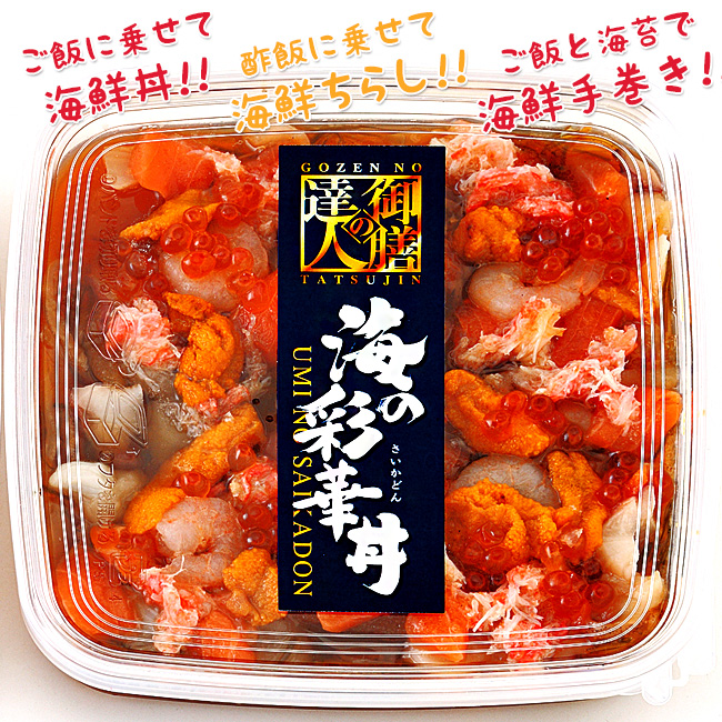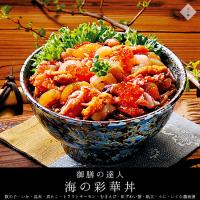人気の具材をちりばめた【彩華丼の具】です。そのまま食べても美味しいですし、ご飯にかけて【海鮮丼】にしたり、酢飯に乗せて【海鮮ちらし寿司】にしたり、海苔巻の具にして【海鮮手巻き】にしたりと色々楽しめます。
